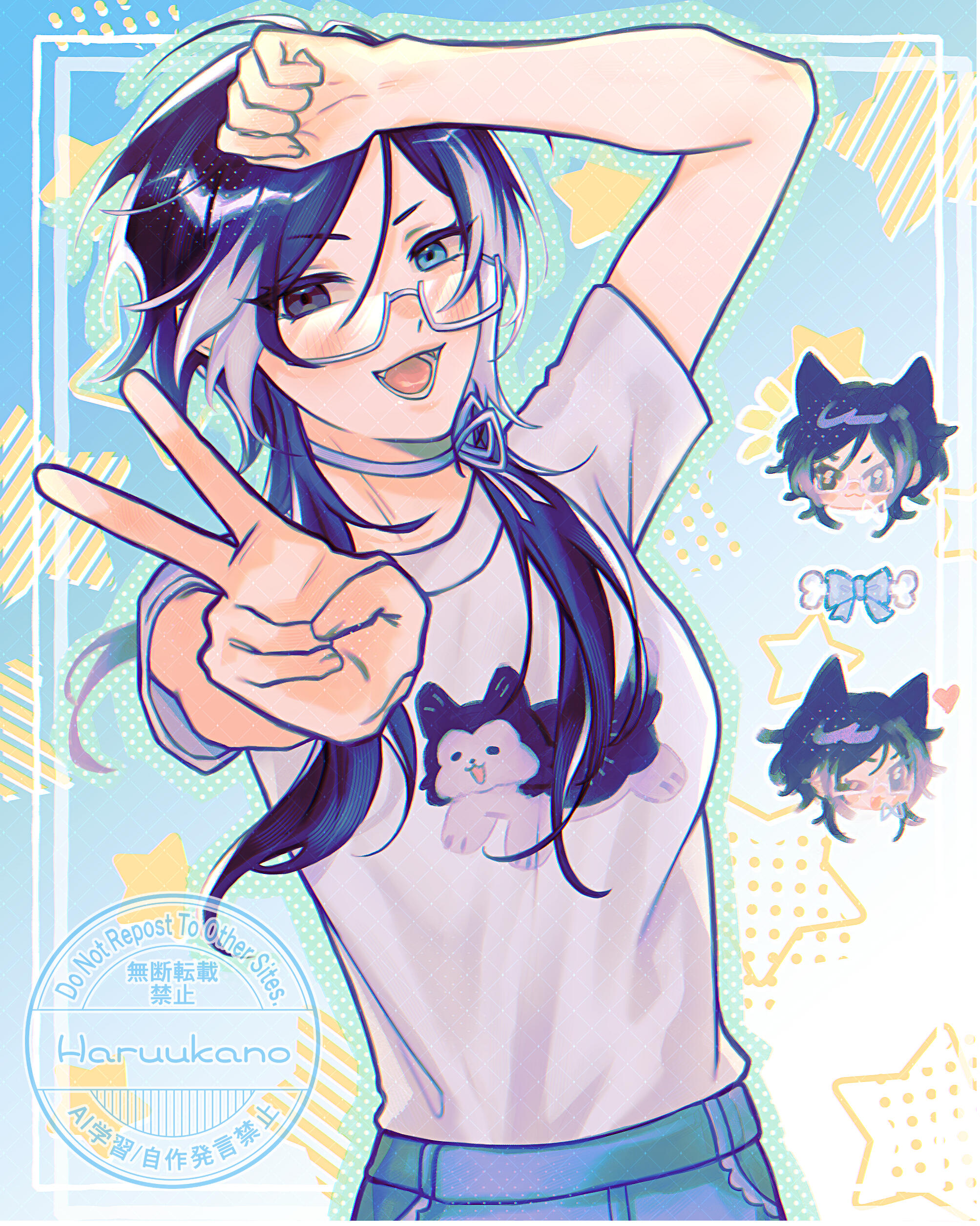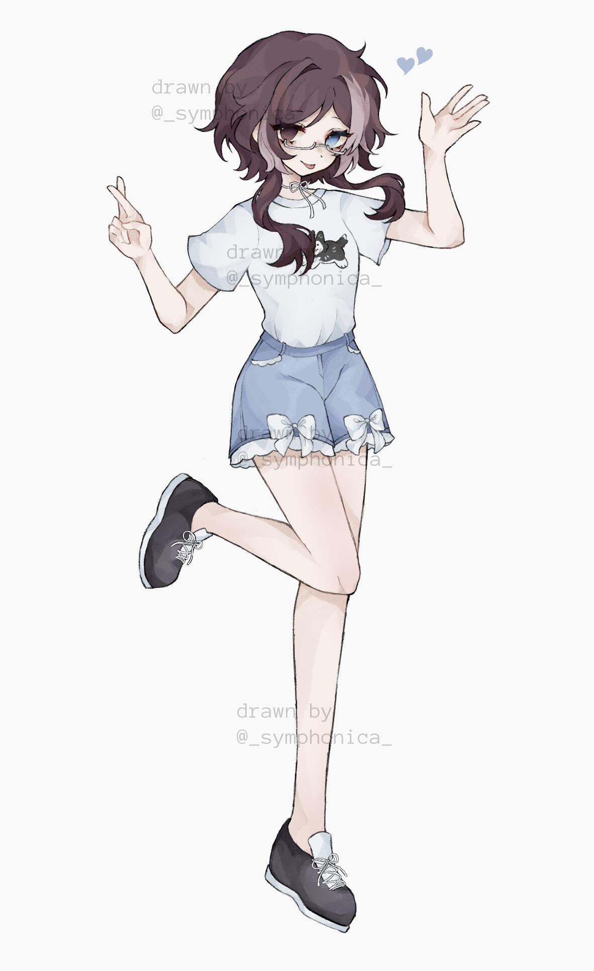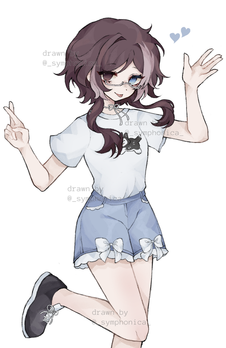 Inuyu resembles a husky (hair colors + mismatched eyes). She is the cool beauty/handsome girl visual type. The ribbon on her neck can vary in color, but it's typically white or blue. She likes bows and dog imagery on her clothes. Wears white glasses.(Tap on the images to enlarge)