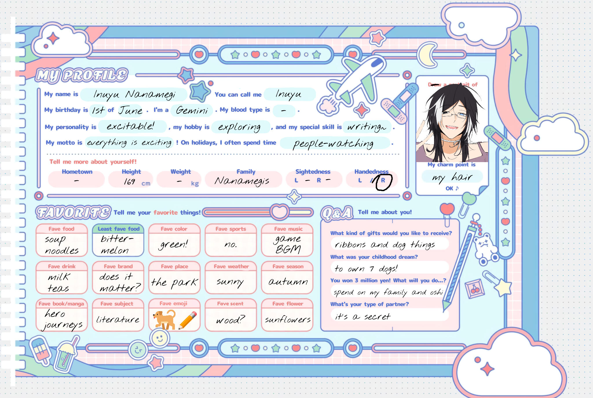 "My name is Inuyu Nanamegi. You can call me Inuyu. My birthday is June 1st. I'm a Gemini. My blood type is -. My personality is excitable, my hobby is exploring, and my special skill is writing. My motto is everything is exciting! On holidays, I often spend time people-watching."
