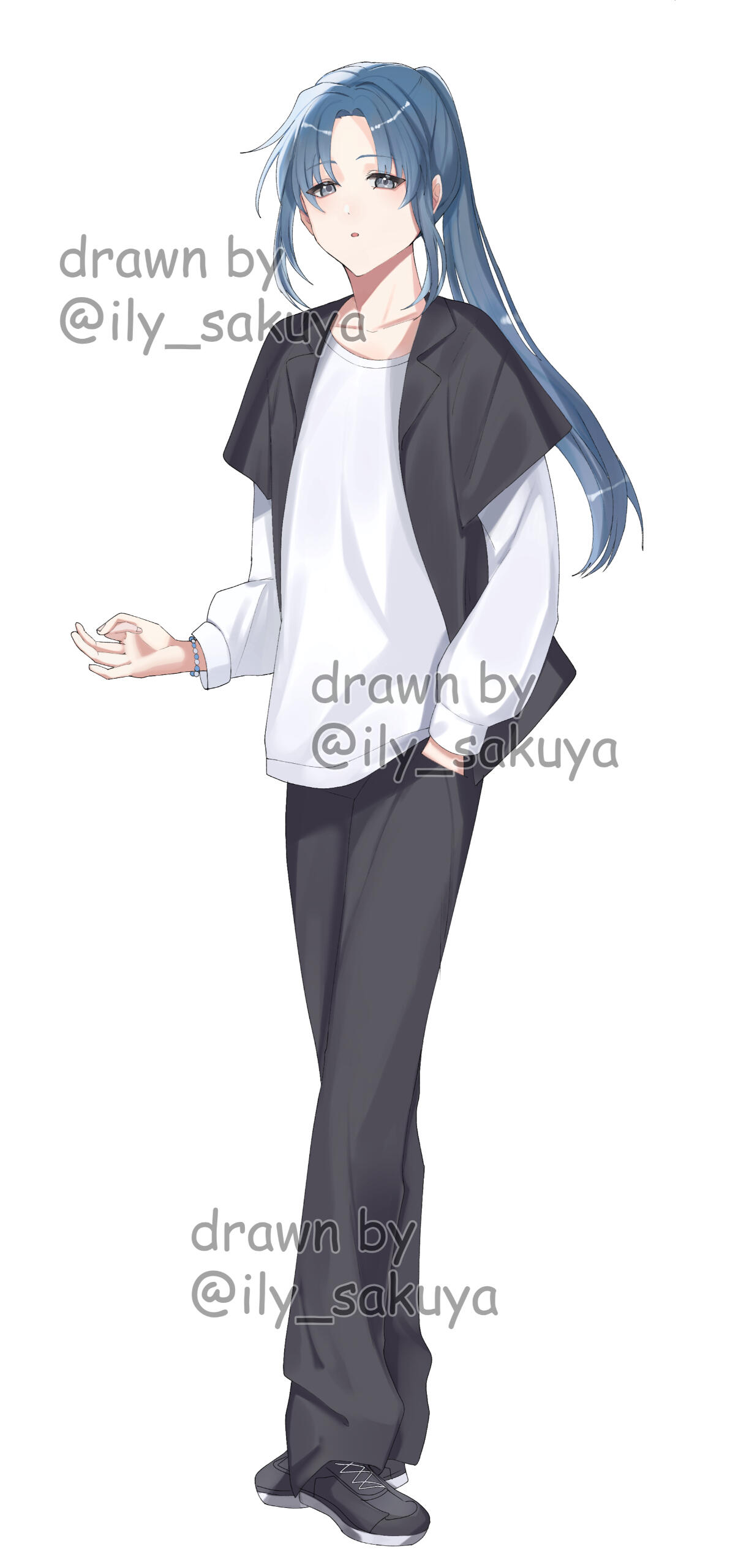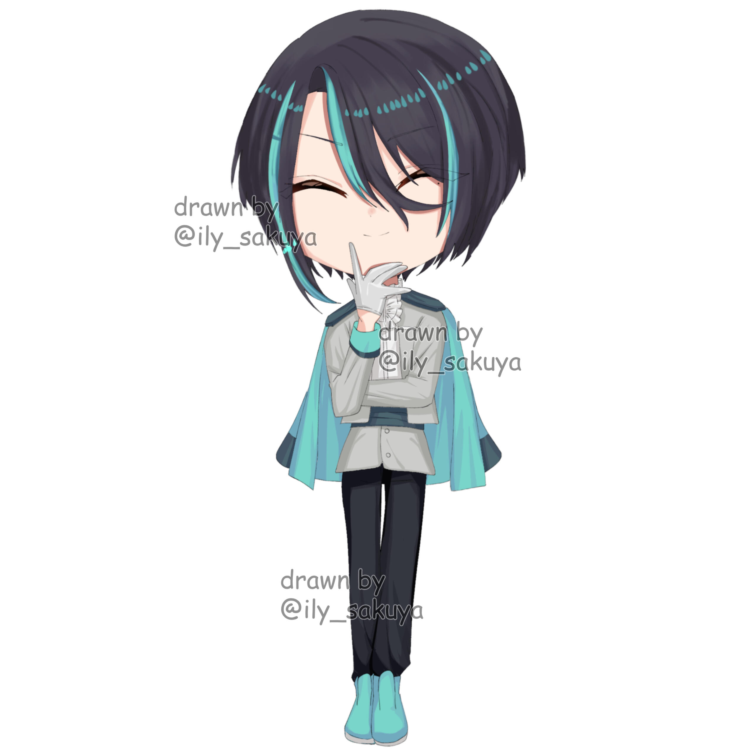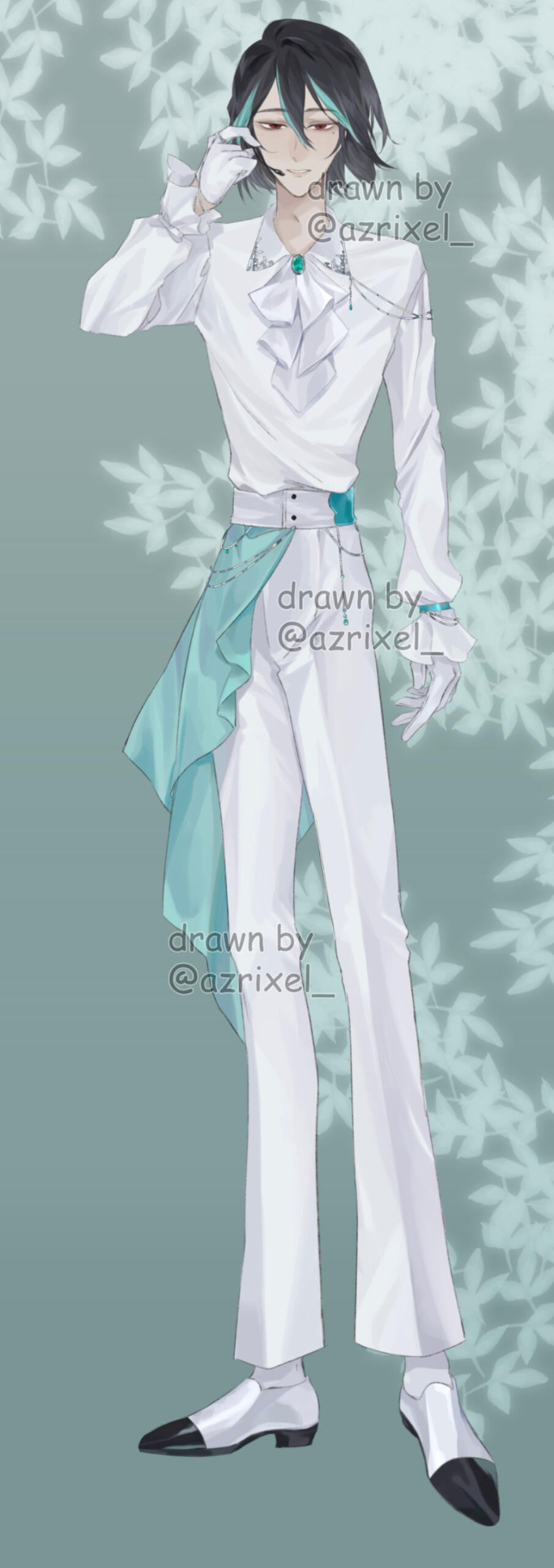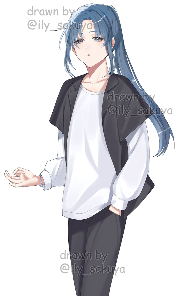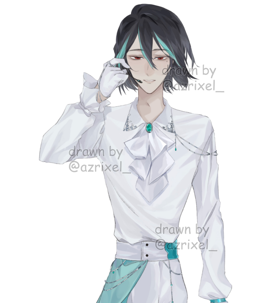 Umishiro has a beauty mark under his left (viewer's right) eye. His eyes are very thin, so they're typically drawn shut! However, they are red. He has long legs and a short torso.(Tap on the images to enlarge)