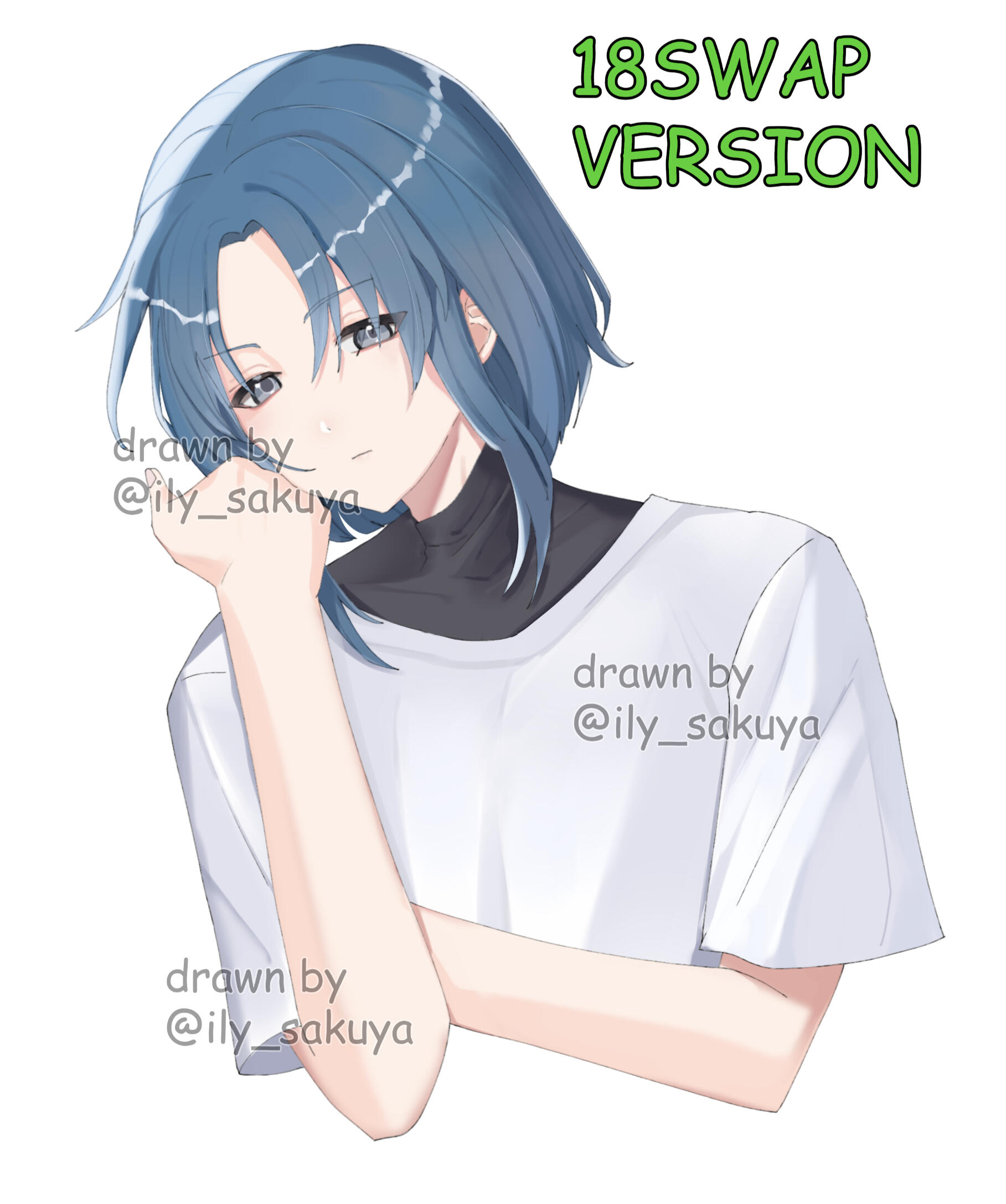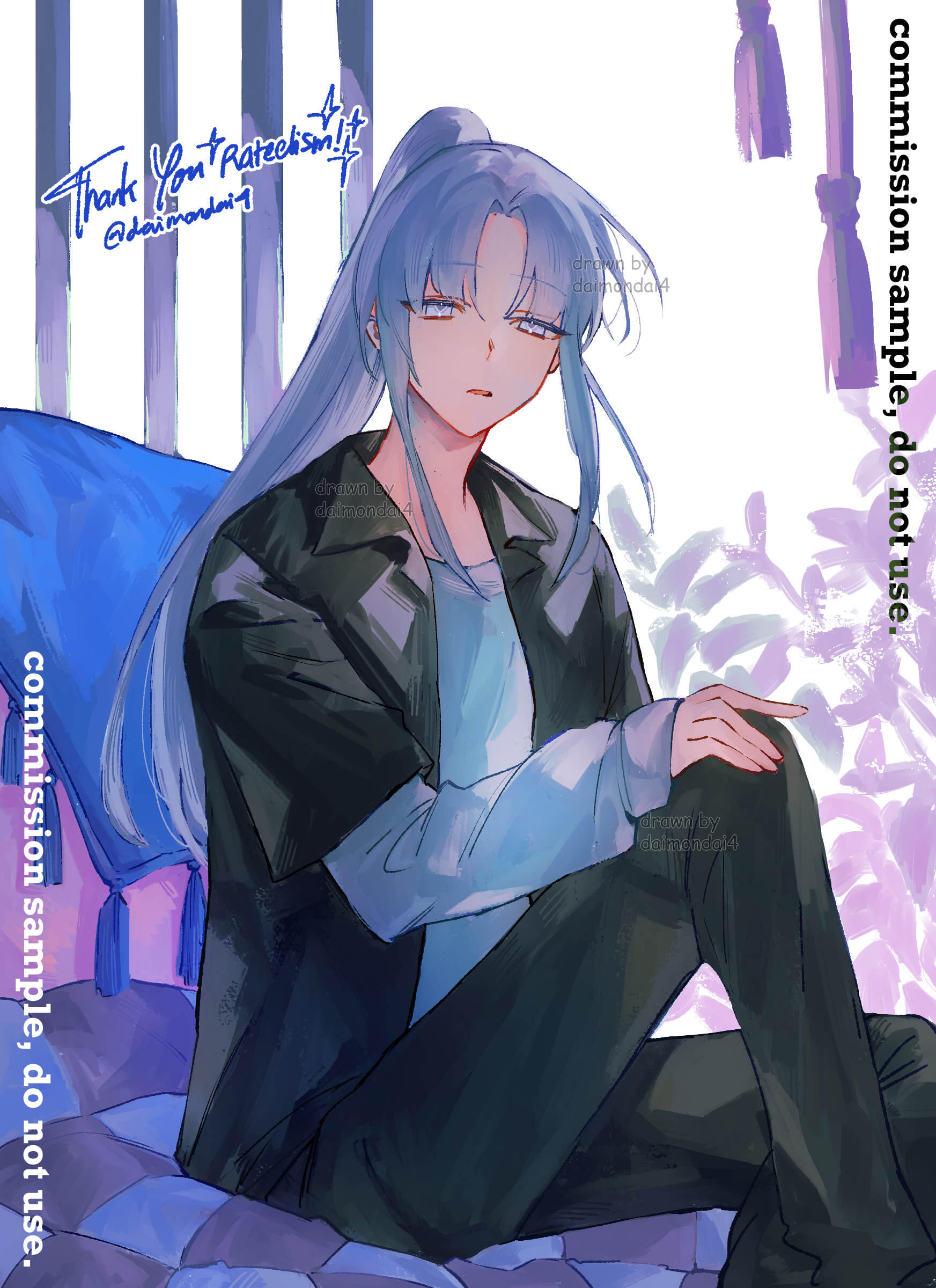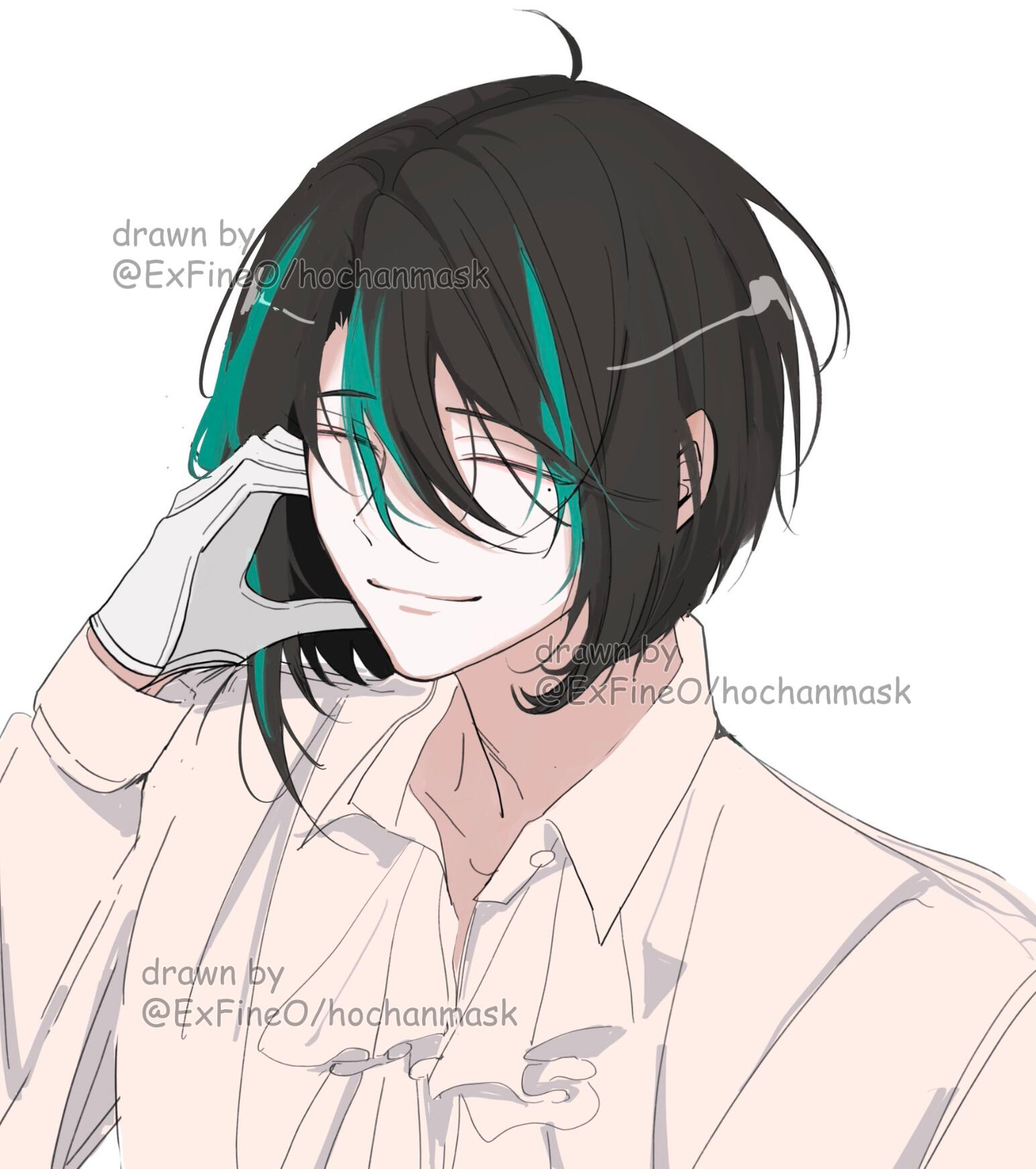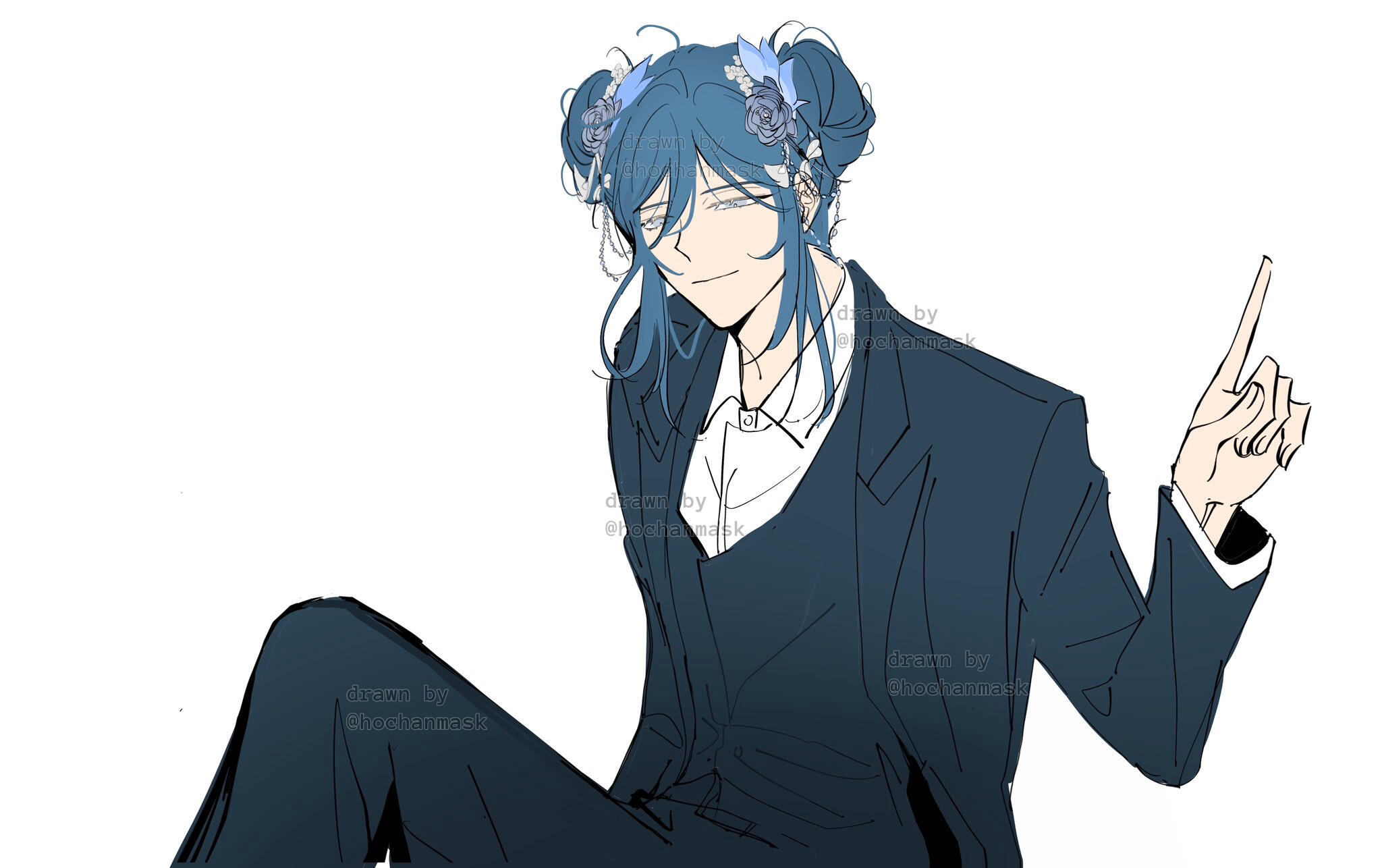 Umishiro has a beauty mark under his left (viewer's right) eye. His eyes are very thin, so they're typically drawn shut! However, they are red. He has long legs and a short torso.(Tap on the images to enlarge)
