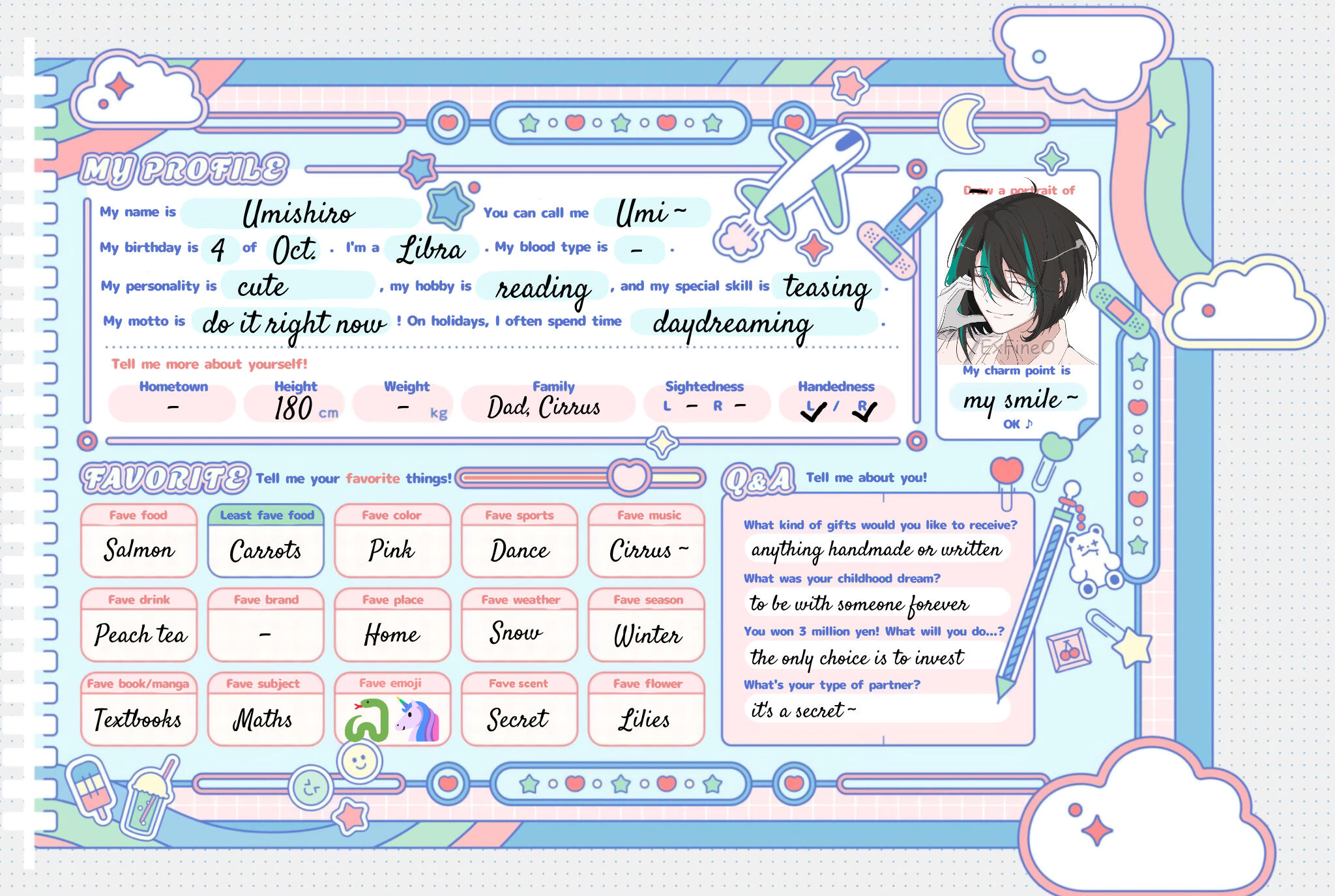 "My name is Umishiro. You can call me Umi~. My birthday is October 4. I'm a Libra. My blood type is -. My personality is cute, my hobby is reading, and my special skill is teasing. My motto is do it right now! On holidays, I often spend time daydreaming."