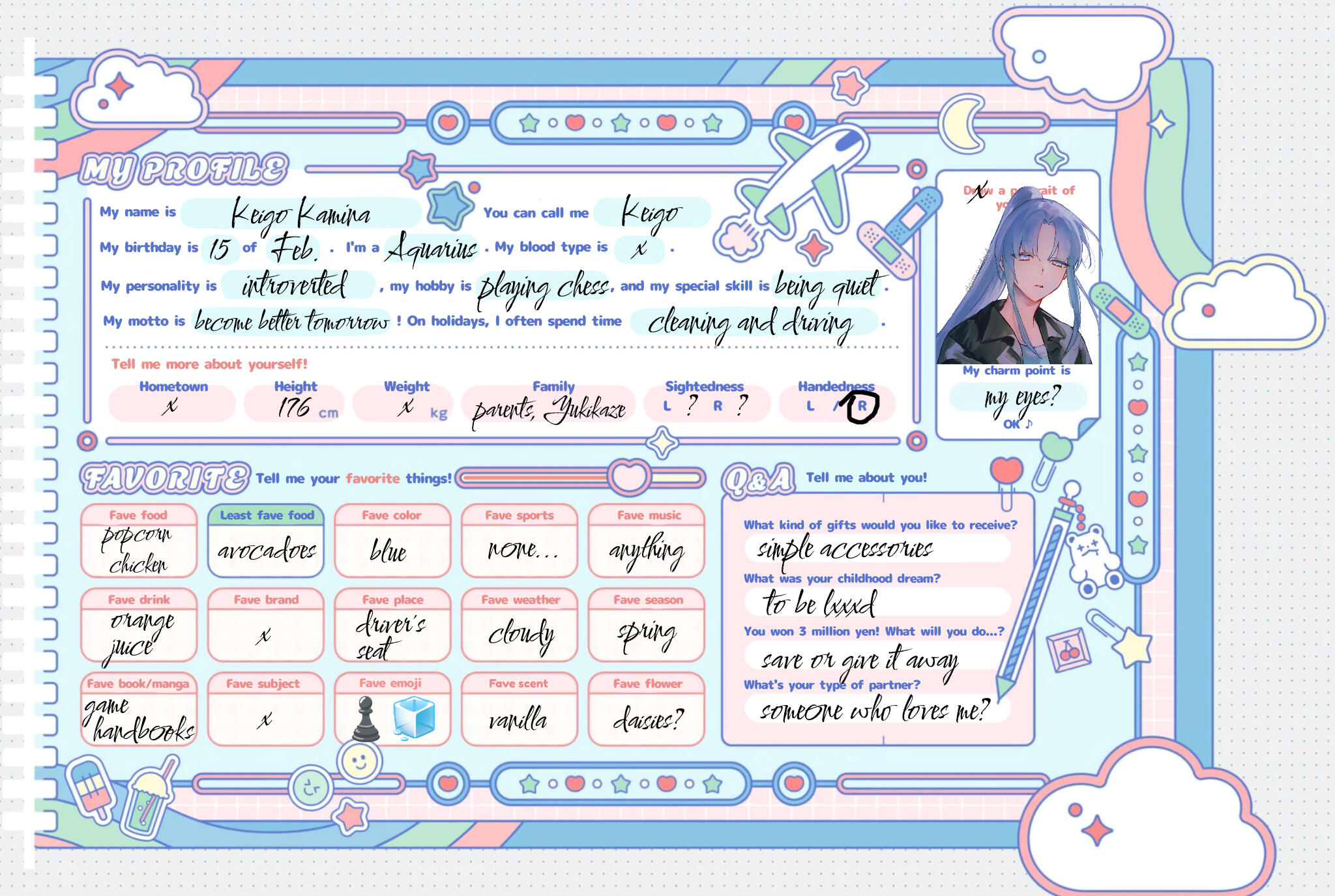 "My name is Keigo Kamina. You can call me Keigo. My birthday is February 15. I'm an Aquarius. My blood type is x. My personality is introverted, my hobby is playing chess, and my special skill is being quiet. My motto is become better tomorrow! On holidays, I often spend time cleaning and driving."